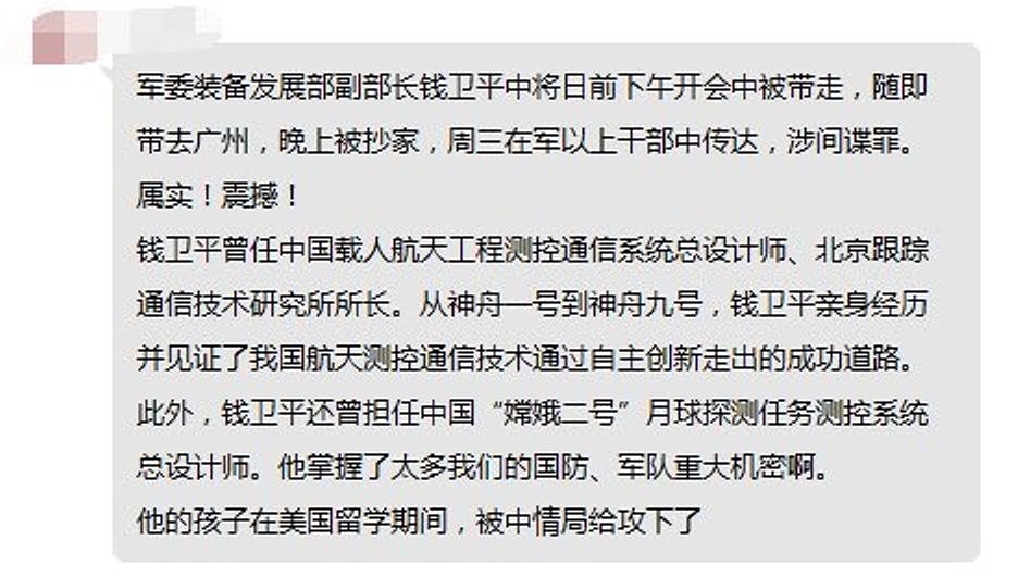 Tin đồn về vụ án gián điệp Tiền Vệ Bình, lần đầu tiên xuất hiện trên các trang mạng xã hội ở nước ngoài, sau đó trên các mạng Wechat và Weibo ở Trung Quốc Đại lục, đến lúc này vẫn chưa bị gỡ bỏ. Thế giới bên ngoài đánh giá rằng tin tức này có thể là sự thật. Tin tức cho biết: “Thiếu tướng Tiền Vệ Bình, Phó Cục trưởng Cục Phát triển trang bị của Quân ủy trung ương, đã bị bắt đi khi đang dự cuộc họp vào buổi chiều 2/7. Ông ta được đưa ngay về Quảng Châu và bị khám nhà vào buổi tối. Ngày 3/7, thông tin về việc phạm tội gián điệp của Tiền Vệ Bình đã được thông báo tới các cán bộ cấp quân đoàn trở lên. Đây là tin chính xác và gây chấn động!”.