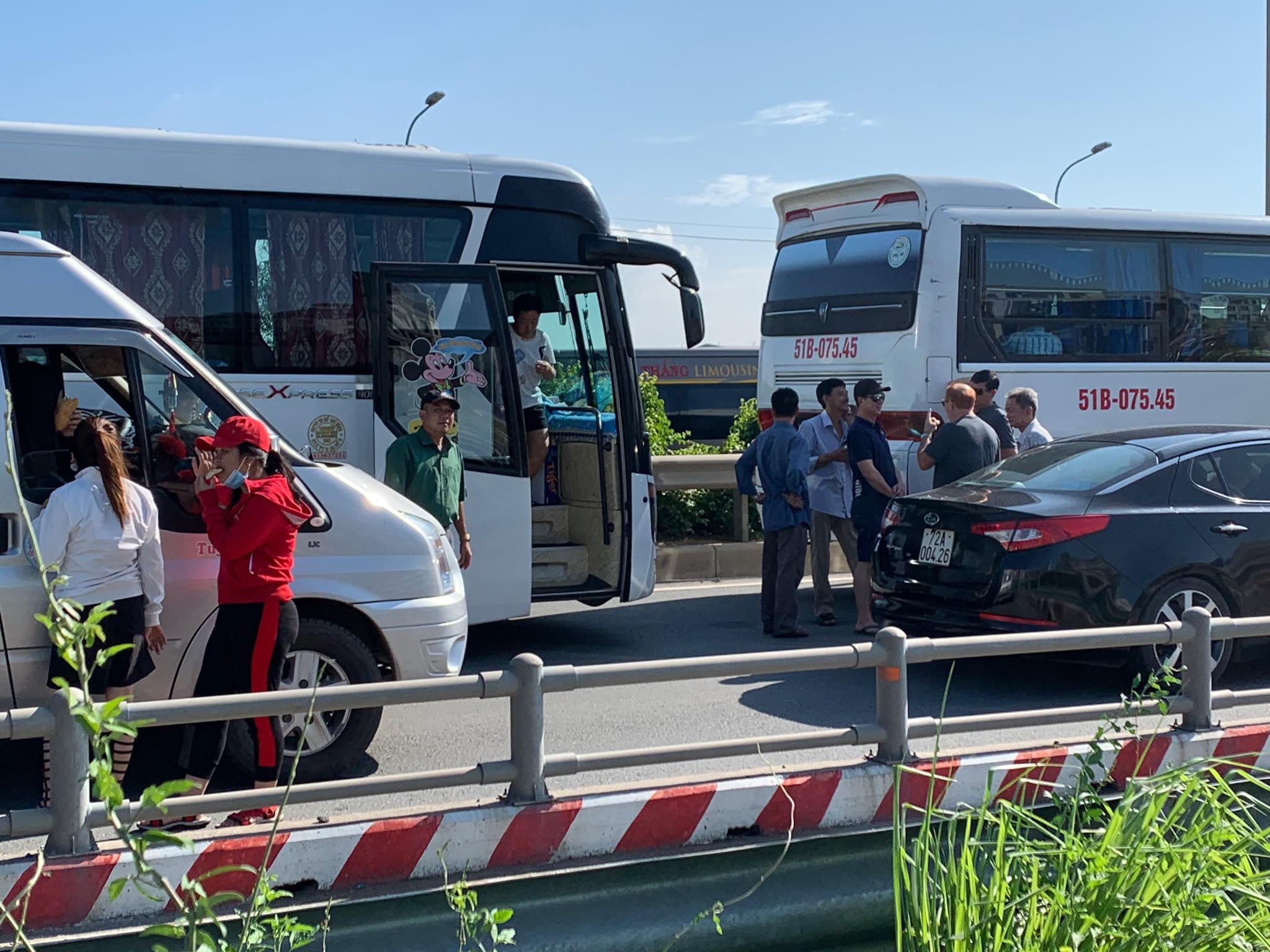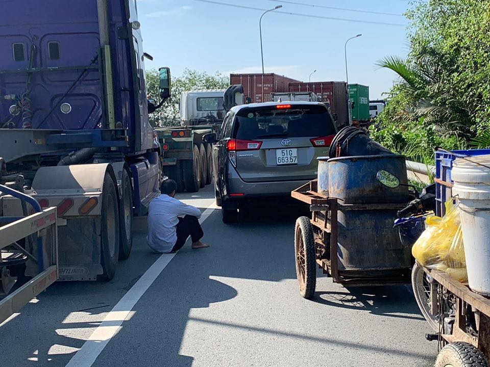 Đến 12h trưa cùng ngày, xe container, xe khách, xe tải… từ nút giao An Phú lên cao tốc HLD gần như bị “tê liệt” hoàn toàn, kẹt xe kéo dài đến tận nút giao Phú Hữu (quận 9). Rất nhiều người dân, tài xế đành xuống xe ngồi chờ hết kẹt xe giữa thời tiết nắng gắt. Một số tấp vào quán ăn, uống bên đường tranh thủ mua cơm để ăn “tiếp sức” chờ hết kẹt xe.