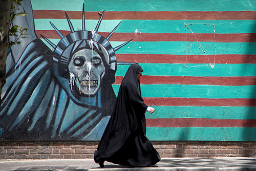 Một phụ nữ đi qua bức tranh tường nhái theo tượng Nữ Thần Tự do của Mỹ ở thủ đô Tehran. Ảnh: Reuters