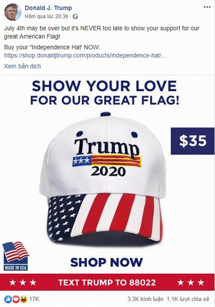 Ông Trump đã mở "shop" bán mũ mới với giá 35$ vào hôm qua. Tổng thống quảng cáo rằng: Ngày 4 tháng 7 có thể kết thúc nhưng KHÔNG BAO GIỜ quá muộn để thể hiện sự ủng hộ của bạn đối với Cờ Mỹ vĩ đại của chúng ta!