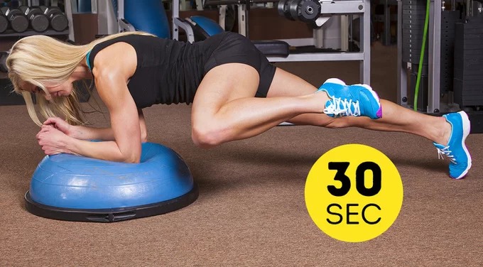 Bài tập này rất tốt cho bụng, hông, mông và cơ vai. Chuẩn bị ở tư thế plank, có thể đặt tay trên bóng để tăng độ khó. Lần lượt rút hai gối lên cao ngang hông liên tục trong 30 giây.