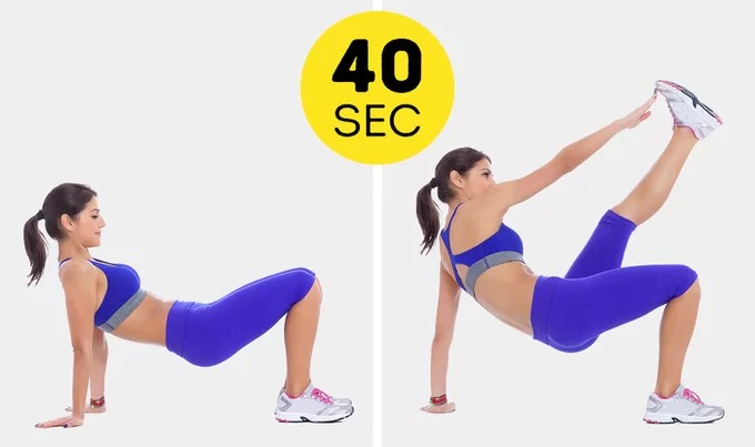 Đây là bài tập giúp giảm mỡ bụng, tăng cơ bắp rất hiệu quả. Chuẩn bị ở tư thế chống đẩy ngược. Đá chân cao đồng thời đưa tay phía bên đối diện chạm vào mũi chân. Lặp lại động tác lần lượt mỗi bên trong 40 giây.
