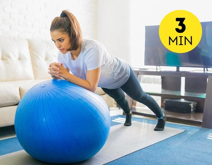 Bài tập này cũng có tác động tích cực đến cơ bụng. Chuẩn bị ở tư thế plank với hai tay nắm lại, đặt trên bóng lớn, kiễng mũi chân. Rút gối lần lượt mỗi bên trong 3 phút.