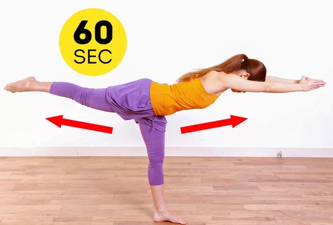 Động tác này giúp tăng khả năng giữ thăng bằng cho cơ thể, làm săn chắc cơ ngực, bụng, mông và bắp đùi. Chuẩn bị ở tư thế đứng thẳng, hai chân rộng bằng vai, nâng gối trái lên, đồng thời, đưa người ngả về phía trước. Từ từ duỗi chân trái thẳng ra sau, cúi gập người tạo góc 90 độ, hai tay duỗi thẳng phía trước. Giữ trong 10 giây rồi trở về tư thế chuẩn bị và đổi bên. Lặp lại động tác trong 60 giây.