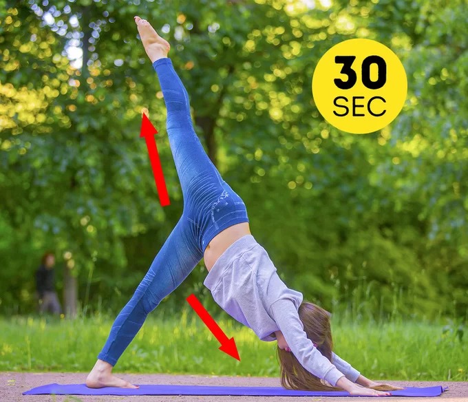 Bài tập này tác động tốt đến phần xương sống và cơ bắp toàn thân. Chuẩn bị ở tư thế đứng thẳng, từ từ cúi người xuống thấp, hai tay chống lên thảm. Nâng một chân lên cao, giữ trong vài giây rồi trở về tư thế chuẩn bị và đổi bên. Lặp lại động tác trong 30 giây.