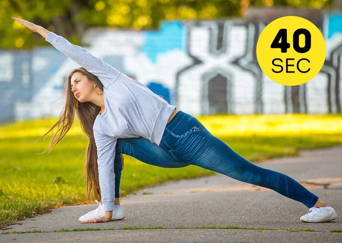Bài tập này cải biên từ một động tác yoga, giúp cải thiện kích cỡ vòng eo. Đứng thẳng, hai chân rộng bằng vai. Mở bàn chân trái nghiêng sang trái, bước một bước dài sang ngang, hạ thấp trọng tâm, tay trái chống xuống đất, người nghiêng sang trái, tay phải đưa thẳng dọc theo tai. Giữ trong vài giây rồi đổi bên, lặp lại động tác trong 40 giây.