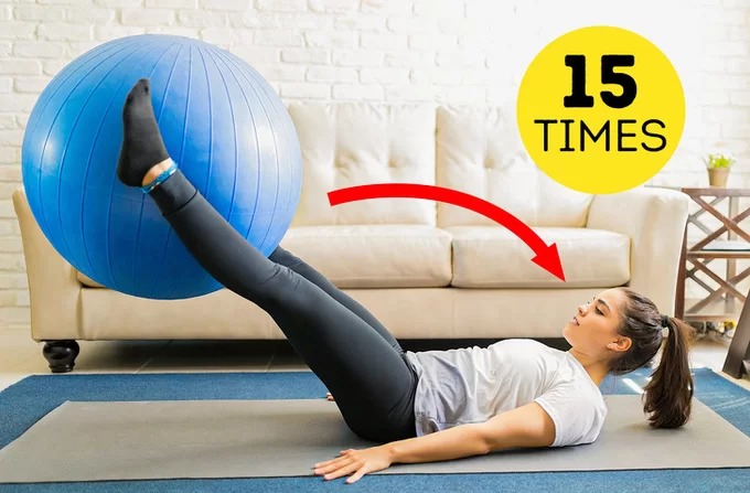 Bài tập này giúp tăng cường cơ bắp cho chân, hông và vai. Chuẩn bị một quả bóng lớn, kẹp ở giữa hai bàn chân, nằm ngửa trên sàn, hai tay duỗi thẳng. Nâng chân cùng bóng lên cao, đồng thời, nâng cao đầu và cổ. Giữ trong vài giây rồi trở về tư thế chuẩn bị. Lặp lại động tác 15 lần.