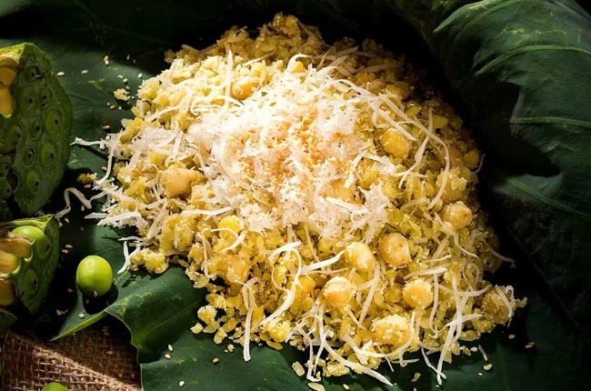 Những chiếc lá sen có rất nhiều công dụng trong cuộc sống hằng ngày và món lá sen bọc gà đắp đất nướng là tuyệt phẩm. Gà được bọc lá sen thơm vị, nướng chín trong lửa, mở ra thơm lừng ngõ phố. Cơm hấp lá sen cùng với hạt sen, ngô non, gạo nếp thơm dẻo cũng khiến thực khách không thể nào quên.