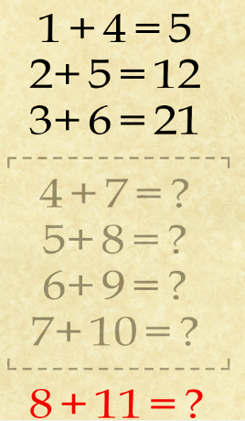 Cách giải: Mỗi số đầu tiên và số thứ hai của các phép tính đều tạo thành một chuỗi số theo thứ tự lần lượt là: "1, 2, 3" và "4, 5, 6". Phép tính cuối cùng tuy phá vỡ quy tắc này, nhưng trên thực tế nó lại hoàn toàn phù hợp, nếu như thêm bốn phép tính nữa vào giữa phép tính thứ ba và phép tính cuối. (Xem minh họa).