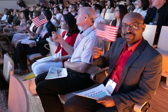 Người nhập cư trong một buổi lễ nhập tịch chính thức trở thành công dân Mỹ. Ảnh: AP.
