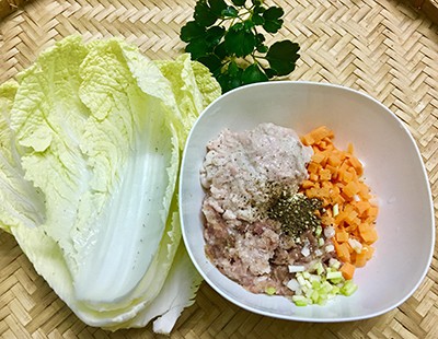Bước 1: Cho thịt, giò sống, carot, đầu hành vào tô, ướp 1/2 muỗng hạt nêm, 1 muỗng tiêu, 1/2 muỗng nước mắm, 1/2 muỗng đường, trộn đều. Cải thảo c.ắt. bớt phần thân cứng, chần qua nước sôi có ít muối để cải được mềm, vớt ra để ráo.