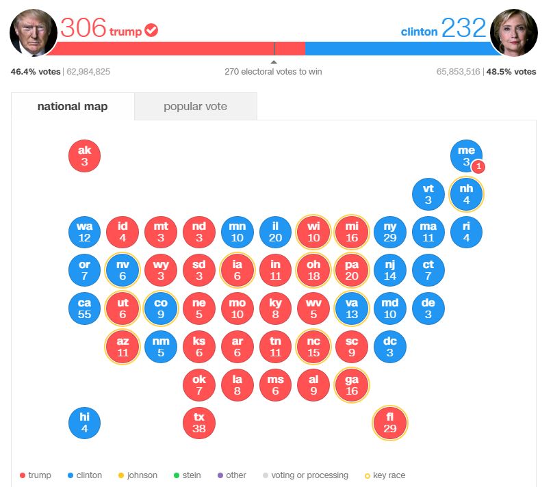 Tổng thống Trump giành chiến thắng năm 2016 với số phiếu đại cử tri cao hơn đối thủ đảng Dân chủ.