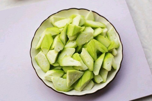 - Bước 2: Đun nóng một ít dầu ăn trong chảo, cho gốc hành và tỏi vào xào thơm sau đó đổ mướp vào đảo chung cho đến khi mướp đổi màu. Thêm lượng nước vừa ăn vào đun sôi.