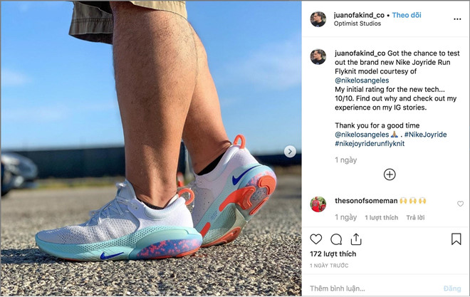 Một tài khoản khác bình luận về Joyride: "Tôi có cơ đề trải nghiệm mẫu mới nhất của Nike Joyride Run Flyknit theo lời mời của @Nikelosangeles. Ý kiến ban đầu của tôi về công nghệ mới này... là 10/10". Ảnh chụp màn hình.