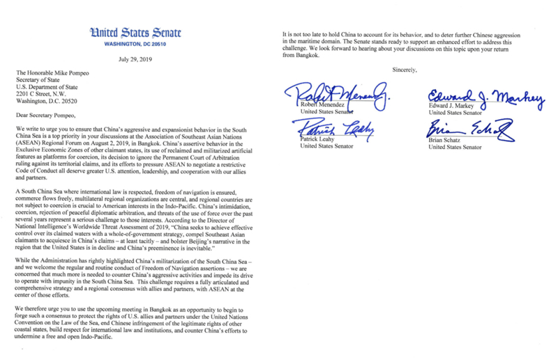 Bức thư với chữ kư của cả bốn Thượng nghị sỹ kêu gọi Ngoại trưởng Pompeo đảm bảo vấn đề về những hành vi gây hấn và bành trướng của Trung Quốc ở Biển Đông là ưu tiên hàng đầu trong các cuộc thảo luận tại Diễn đàn Khu vực ASEAN (ARF) ngày 2/8 ở Bangkok, Thái Lan.
