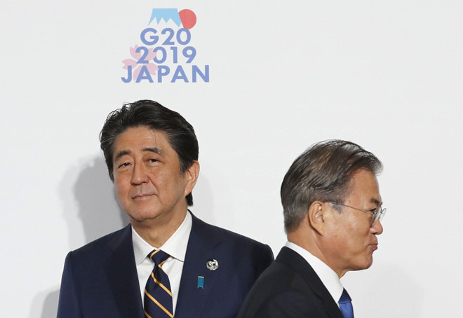 Tổng thống Hàn Quốc Moon Jae In đi qua Thủ tướng Nhật Bản Shinzo Abe ở hội nghị G-20 ở Osaka, Nhật Bản ngày 28/6. Ảnh: Getty Images.