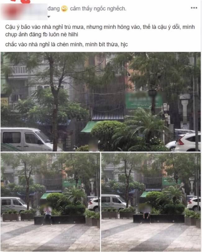 Chàng trai lợi dụng điều kiện thời tiết mưa nên đã tranh thủ rủ bạn gái vào nhà nghỉ để 'trú mưa'. Nhưng cô gái này vô cùng tỉnh táo nên đã từ chối và nhận lại 1 trận giận dỗi ngay dưới mưa từ bạn trai. Cô còn đăng tải lên facebook để bóc mẽ anh chàng này, đúng là cao thủ không bằng tranh thủ