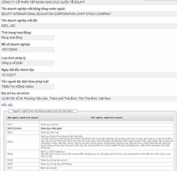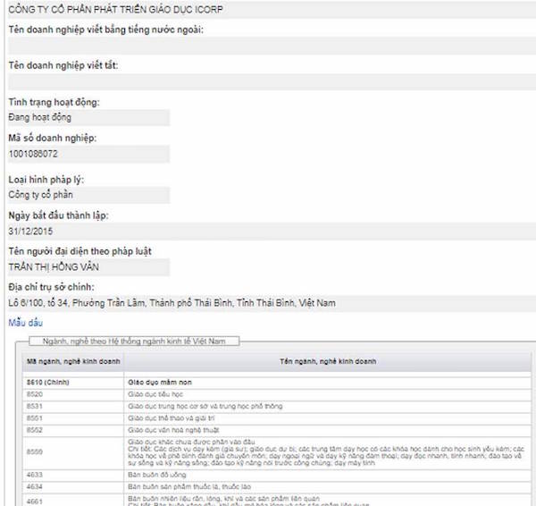 Còn CTCP Phát triển Giáo dục ICorp có cùng người đại diện là bà Trần Thị Hồng Vân và có trụ sở cũng tại phường Trần Lãm, thành phố Thái Bình, tỉnh Thái Bình. Trong khi Công ty Cổ phần Lữ hành Quốc tế Fuyou, có người đại diện Đỗ Thanh Long (sinh năm 1980), người ở cùng địa chỉ nhà với bà Hạnh.