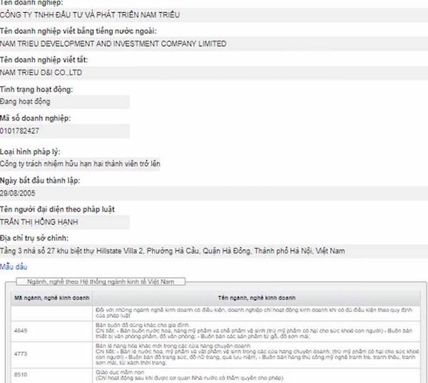 Nam Triều cũng có người đại diện theo pháp luật là Trần Thị Hồng Hạnh và có trụ sở cùng phường Hà Cầu, Quận Hà Đông, Hà Nội.