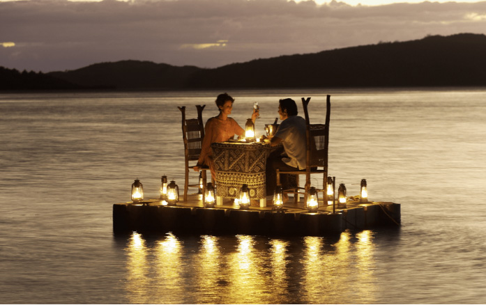 Nhà hàng của khu nghỉ mát phục vụ bữa tối xa xỉ và vô cùng lãng mạn với một bàn cho hai người trên một chiếc phao gỗ được thắp sáng ở giữa Đầm xanh mênh mông.