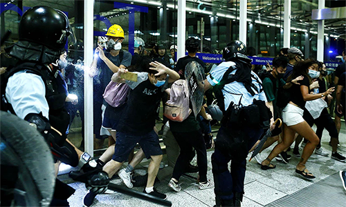 Cảnh sát chống bạo động trấn áp người biểu tình tại sân bay quốc tế Hong Kong tối 13/8. Ảnh: Reuters.