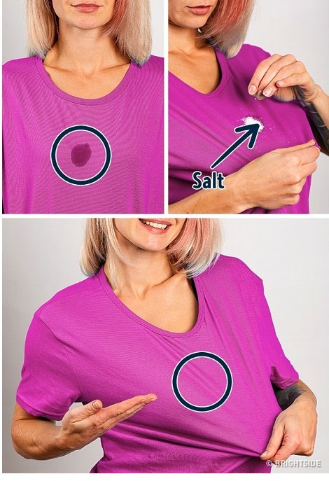 Muối có thể hấp thụ tốt dầu mỡ. Vậy nên, nếu bạn vừa đánh rớt một ít dầu mỡ lên áo, hãy rắc ngay muối lên vị trí đó. Với những vết dầu lớn, điều này sẽ giúp cho việc giặt rửa dễ dàng hơn, còn những vết dầu nhỏ sẽ tự động biến mất