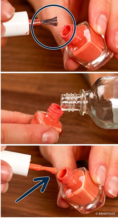 Với sơn móng tay trong lọ đã bị khô lại, bạn có thể đổ một vài giọt dung dịch tẩy sơn vào. Điều này không chỉ giúp hòa tan phần sơn khô mà còn khiến sơn trông sáng hơn. Tuy nhiên, hãy điều chỉnh lượng dung dịch thêm vào vừa phải để sơn không bị loãng
