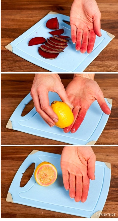 Sau khi chế biến các loại củ quả để lại màu trên tay như củ dền, nghệ…, đừng vội rửa xà phòng vì điều này sẽ khiến màu càng bám mạnh hơn. Thoa tay với một chút nước chanh hoặc kì cọ với chanh cắt miếng sẽ khiến màu trên tay dễ rửa trôi hơn