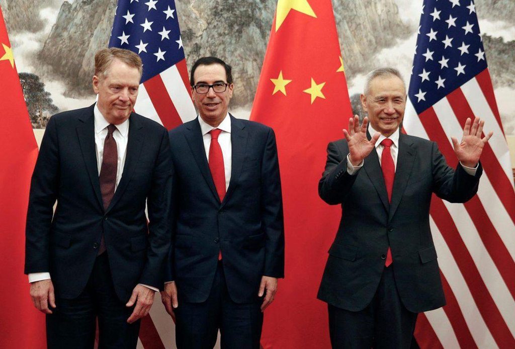 Phó Thủ tướng Trung Quốc (phải) giơ tay khi Bộ trưởng Tài chính Mỹ Steven Mnuchin (giữa) trò chuyện với Đại diện Thương mại Robert Lighthizer trước khi tiến hành cuộc họp ở Nhà khách Quốc gia Điếu Ngư Đài tại Bắc Kinh. Ảnh: AP.