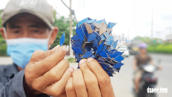 Trên đoạn đường khoảng 100m, ông Thành đã thu gom được hàng trăm chiếc đinh hình thoi sắc nhọn hai góc, tổng trọng lượng gần 200gr. Hầu hết số đinh thu gom được đều còn rất mới và có màu xanh. "Tôi gom hôm trước thì hôm sau những miếng đinh nhọn như thế này lại xuất hiện" - ông Thành bức xúc.