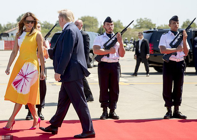 Đệ nhất phu nhân Mỹ thu hút ống kính phóng viên và những người có mặt ở sân bay của Biarritz, thuộc Pyrénées-Atlantiques, khi rời khỏi chiếc Air Force One và sải bước trên lối đi được trải thảm đỏ. Bà mặc chiếc váy Calvin Klein 650 USD màu vàng trắng kết hợp đôi giày cao gót Louboutin màu hồng.
