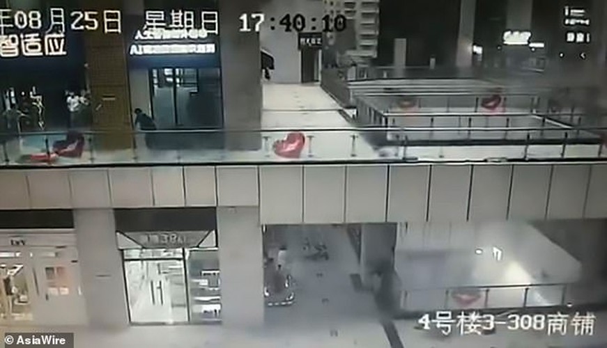 Theo Daily Mail, vụ việc người phụ nữ bị nước hất văng xảy ra tại trung tâm thương mại Huixing ở thành phố Đông Hoản, tỉnh Quảng Đông, Trung Quốc, vào khoảng 17h40 ngày 25/8 giữa lúc khu vực này đang hứng chịu cơn bão Bailu. (Nguồn ảnh: Daily Mail/AsiaWire)