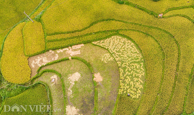 Trong tiết trời se lạnh của mùa thu, cả thung lũng bỗng bừng lên sắc màu ấm áp, tươi sáng. Nhiều thửa ruộng bậc thang đan xen vào nhau tạo nên những đường cong uốn lượn tuyệt đẹp.