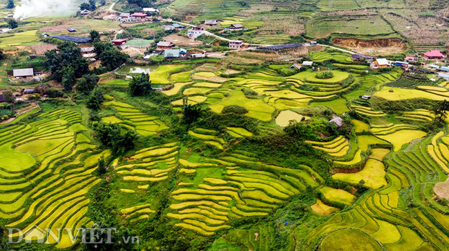Dưới góc nhìn của flycam, bạn sẽ bị hớp hồn bởi những cung đường tuyệt đẹp, được điểm tô bởi sắc màu rực rỡ của đồng lúa rộng lớn trải dài đến đường chân trời.