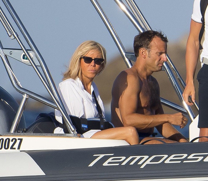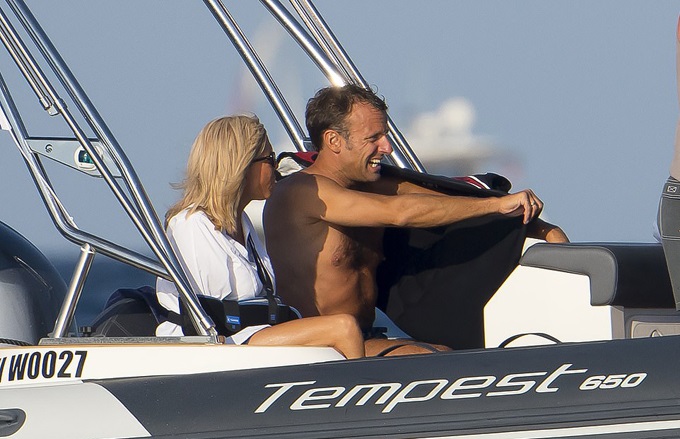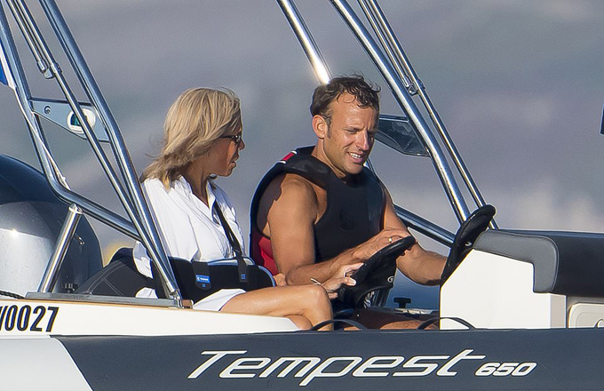 Hôm 23/8, Tổng thống và đệ nhất phu nhân Pháp được một nhóm vệ sĩ hộ tống đi trên tàu cao tốc ở ven biển Địa Trung Hải, gần Fort de Bregançon, để giải trí trong kỳ nghỉ hè tại đây.