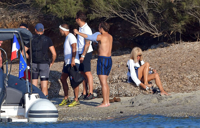 Cả đoàn sau đó lên bờ và ông Emmanuel mặc lại áo, còn bà Brigitte ngồi lau chân. Đệ nhất phu nhân Pháp vừa trải qua ca phẫu thuật thẩm mỹ trẻ hóa da mặt hồi tháng 7.