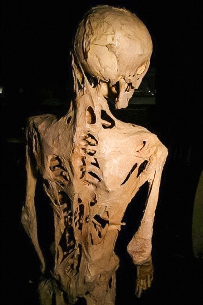 Trong bức ảnh là một bộ xương của người mắc bệnh xơ hóa, cơ thể họ dần dần được bao phủ bởi các mô xương, khiến họ mất đi khả năng di chuyển bình thường và tử vong sớm. Hiện tại không có biện pháp phòng ngừa hoặc điều trị hiệu quả.