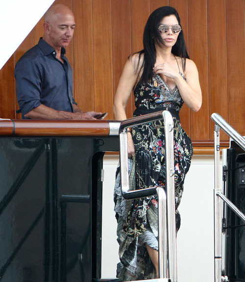 Ông Jeff (bên phải, hàng trên) và người tình (thứ tư từ trái sang, hàng trên) cùng một vài người bạn giàu có trên du thuyền của doanh nhân David Geffen. Jeff Bezos tuyên bố ly hôn người vợ 25 năm chung sống hồi tháng 1. Thủ tục ly dị hoàn tất, và bà Mackenzie, vợ ông, được chia cổ phần trị giá 38 tỷ USD của Amazon. Trong khi đó Sanchez, một người dẫn chương trình ở Mỹ, cũng đệ đơn ly hôn chồng hồi tháng 4. Đầu tháng 8, Jeff được cho là đã không tham dự sự kiện Google Camp để ra mắt bố mẹ người tình. (Ảnh: MEGA)