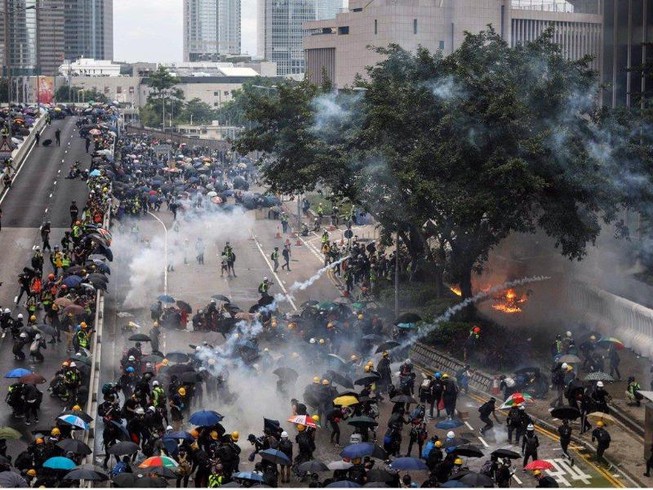 Cảnh sát bắn hơi cay vào người biểu tình Hong Kong ngày 31-8. Ảnh: SCMP