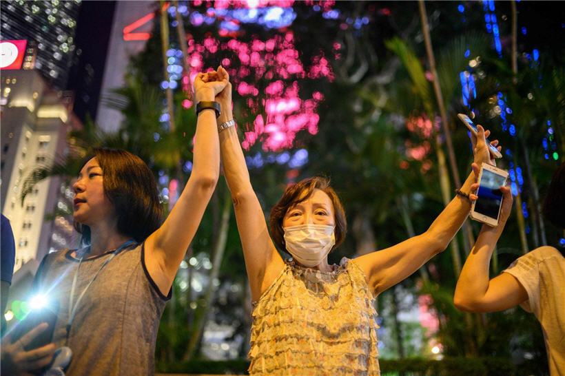 Khuya 23 Tháng Tám ở Hồng Kông có cuộc nắm tay nhau lập chuỗi người đòi tự do dân chủ. (Hình: Anthony Wallace/AFP/Getty Images)