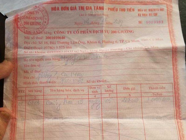Cụ thể, ông Vinh nằm giường dịch vụ ở khu dịch vụ cạnh BV, đã chi trả 208.000 đồng/ngày, nhân năm ngày ra 1.040.000 đồng. Thế nhưng ông Vinh còn bị tính thêm một giường bệnh khác, đó là giường nội khoa loại I, hạng II, khoa thần kinh của BV tỉnh Cà Mau, mức giá 178.000 đồng/ngày đêm, nhân sáu ngày ra 1.068.000 đồng.