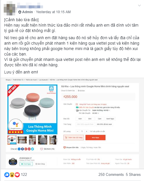 Trong bài viết của mình, quản trị viên S.N đã cáo buộc một cửa hàng trên sàn thương mại điện tử Shopee sử dụng "hình thức lừa đảo mới", bán các sản phẩm giá rẻ nhằm lừa đảo người mua.