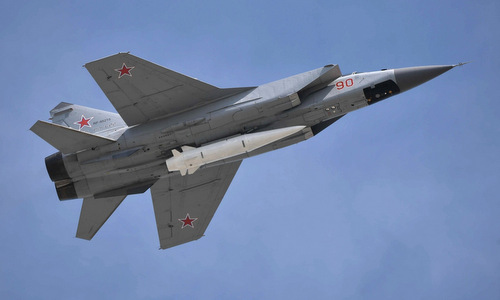 Tiêm kích MiG-31 mang tên lửa siêu vượt âm Kinzhal hồi năm 2018. Ảnh: Điện Kremlin.