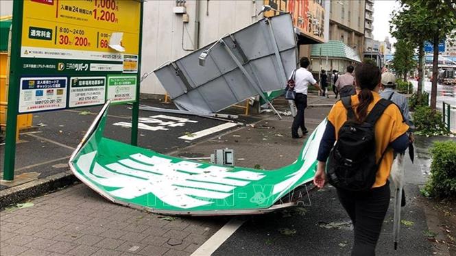 Gió lớn do ảnh hưởng của siêu bão Faxai phá hỏng nhiều biển hiệu ở Tokyo, Nhật Bản ngày 9/9/2019. Ảnh: REUTERS/TTXVN