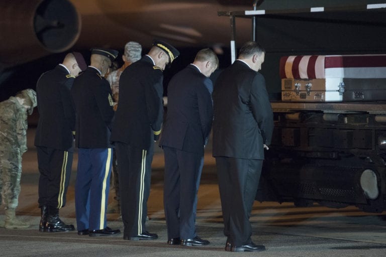 Ngoại Trưởng Mike Pompeo, ngoài cùng bên phải, và một số giới chức Mỹ đón thi hài Thượng Sĩ Elis Barreto Ortiz, 34 tuổi, đưa về từ chiến trường Afghanistan hôm Thứ Bảy.