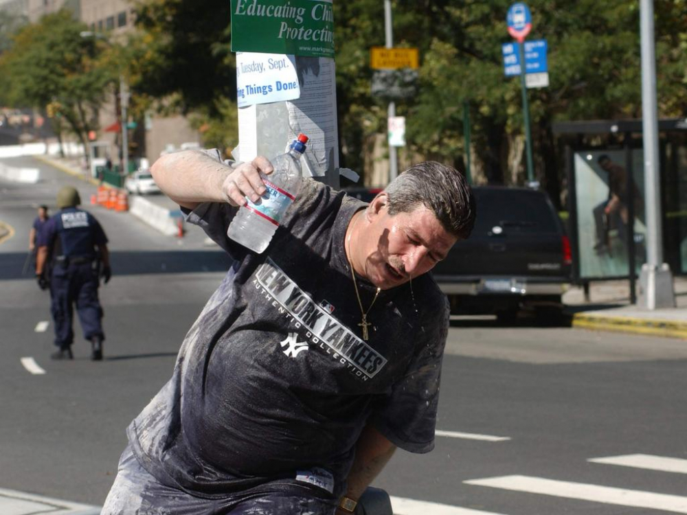 Một người đàn ông phủ đầy bụi bên ngoài Trung tâm Thương mại Thế giới. (Ảnh: Spencer Platt / Getty Images)