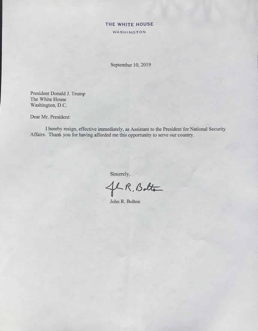 Thư từ chức của ông Bolton, ghi ngày 10/9, là một bức thư ngắn gọn: “Tôi xin từ chức, có hiệu lực ngay lập tức, khỏi cương vị Trợ lý cho Tổng thống về Các vấn đề An ninh Quốc gia. Cảm ơn ngài đã cho tôi cơ hội phục vụ đất nước”.