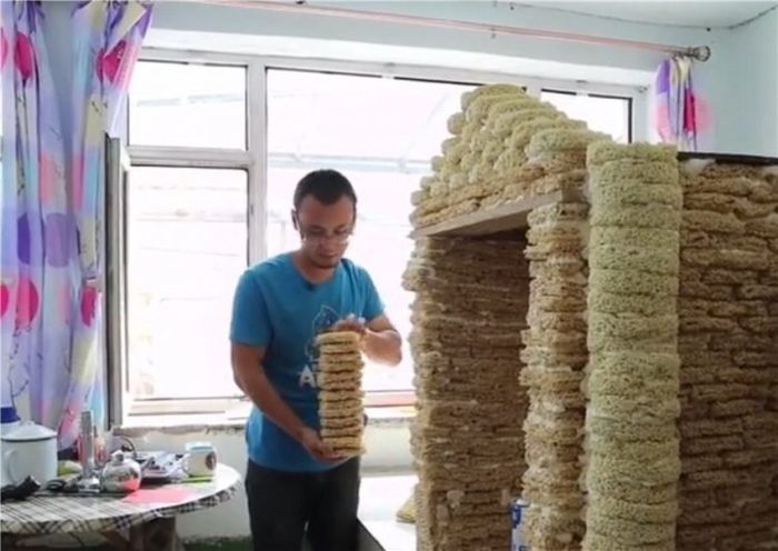 Hình ảnh của ngôi nhà độc nhất vô nhị này đang được chia sẻ nhiều trên mạng xã hội Trung Quốc sau khi người đàn ông tên Zhang đăng tải. Được biết, Zhang, một người làm nghề xây dựng, đã dành 4 ngày để xây nhà từ 2.000 gói mì hết hạn và băng keo.