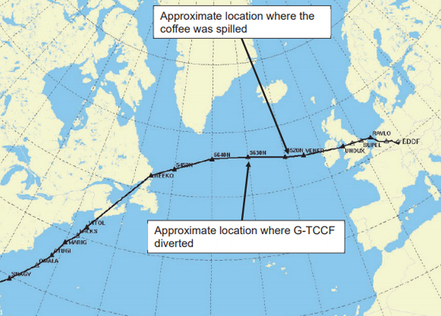 Bản đồ minh họa sự cố. Điểm bên phải là khi cốc café bị đổ, trong khi điểm bên trái là nơi phi công quyết định quay đầu (Ảnh: AAIB)