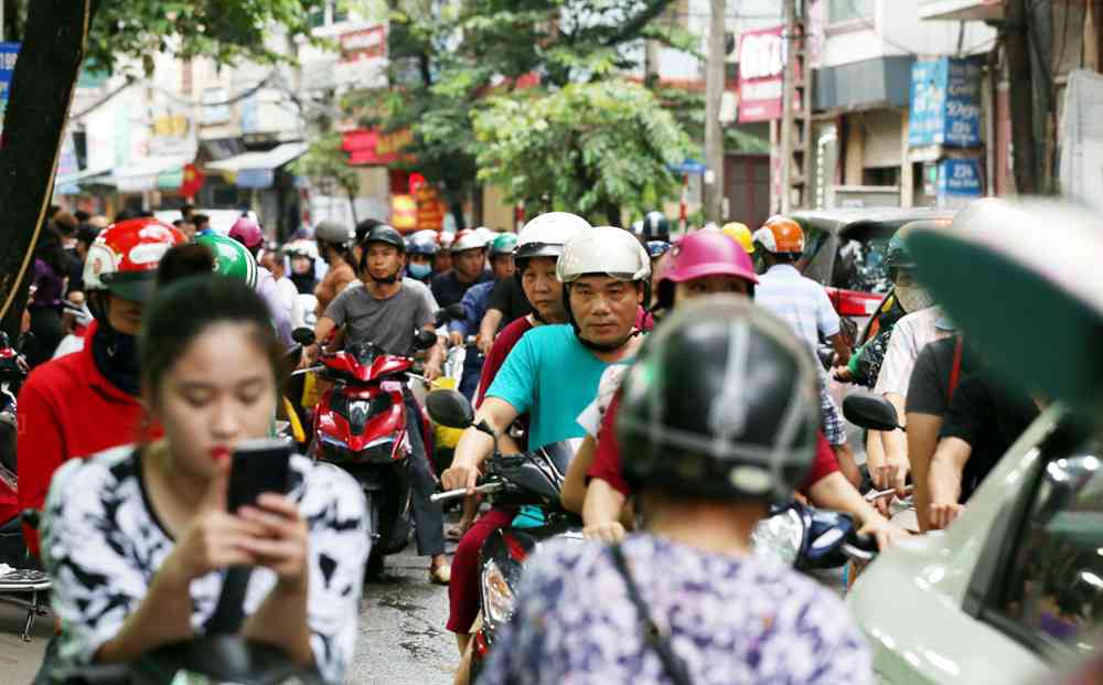Ô tô, xe máy len lỏi, nhích từng chút để di chuyển qua đoạn ùn tắc khoảng 500m.